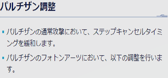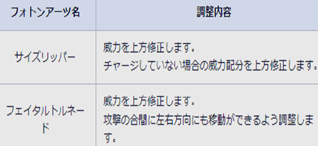 内容はほぼ戦闘バランスの調整で、既存職のスキルやテクニック、PAの挙動や威力修正など。基本的に弱かった部分を強化する上方修正がメイン。