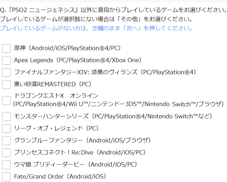 アンケートで他にプレイしてるゲーム聞いてくるの草