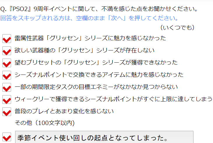 アンケートの不満が5つまでしか選べないのが不満なんですが