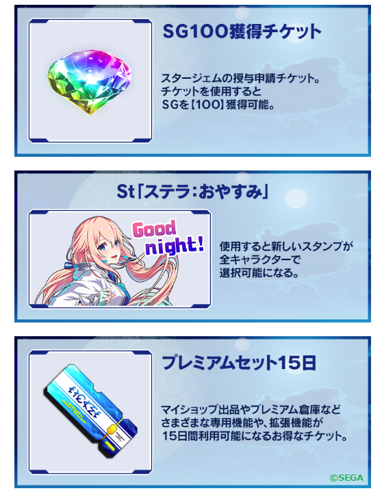 - 100SGやSt「ステラ:おやすみ」はプレイヤーランク1から配布されるので、実質連動している人なら全員配布ということに。一方プレミアムセットはランク30以上だが、イドラバトルでSG稼ぎをしていた人なら達成している可能性も高いはず。