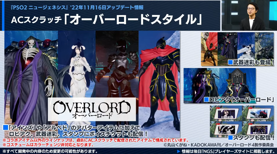 アインズやアルベドのコスやロビアク、武器迷彩、スタンプ、ボイスも実装。