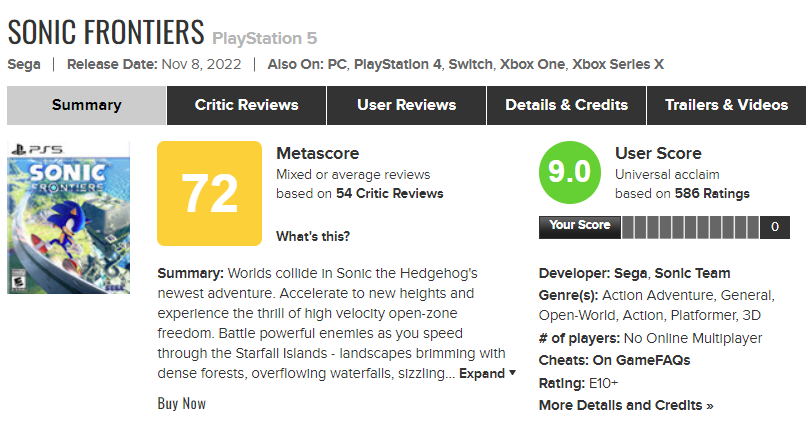 SEGAの新作オープンフィールドゲー「ソニックフロンティア」についての感想スレ。PSO2プレイヤーからの評価はいまいちだが、ユーザースコアはかなり高い模様。