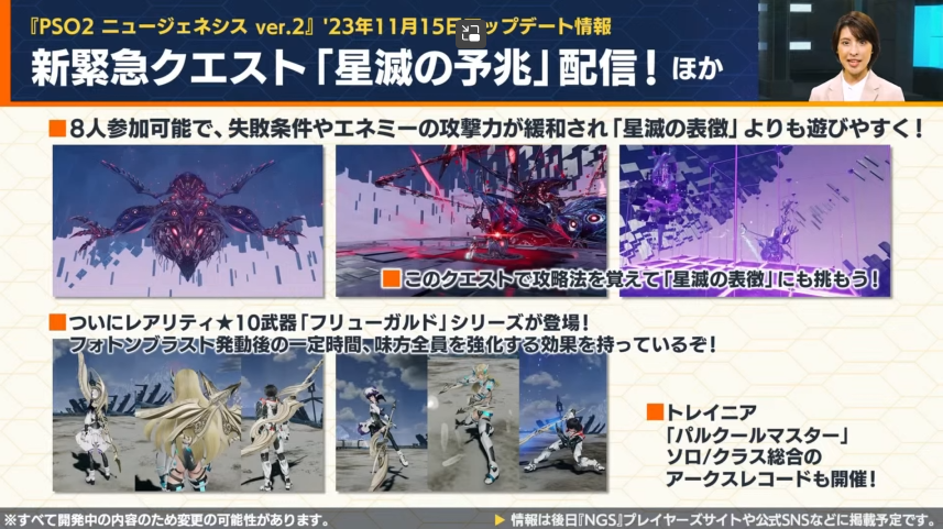 11/15に緊急クエスト「星滅の予兆」が配信される。常設のソウラスに比べ失敗条件やエネミーの強さが緩和され、遊びやすい内容となっているとの事。