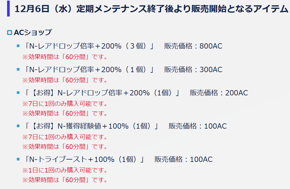 12/6に現在販売されているブーストアイテムが一部販売終了し、新たなブーストアイテムが販売されるようです。