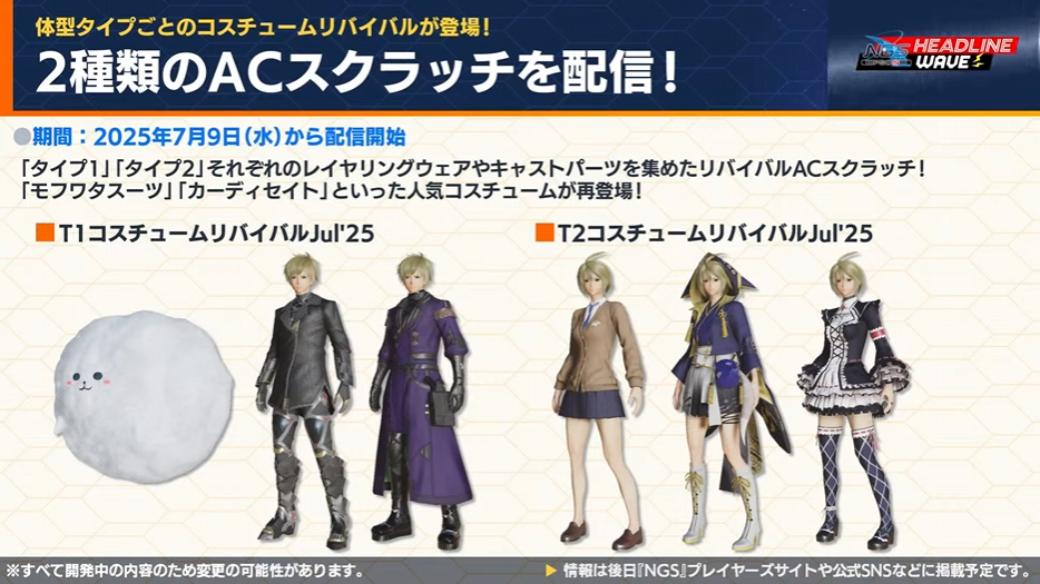 「タイプ 1 」「タイプ 2 」それそれのレイヤリングウェアやキャストパ ー ツを集めたリバイバル AC スクラッチ!「モフワタスーツ」「カーディセイト」といった人気コスチュ ー ムが再登場!