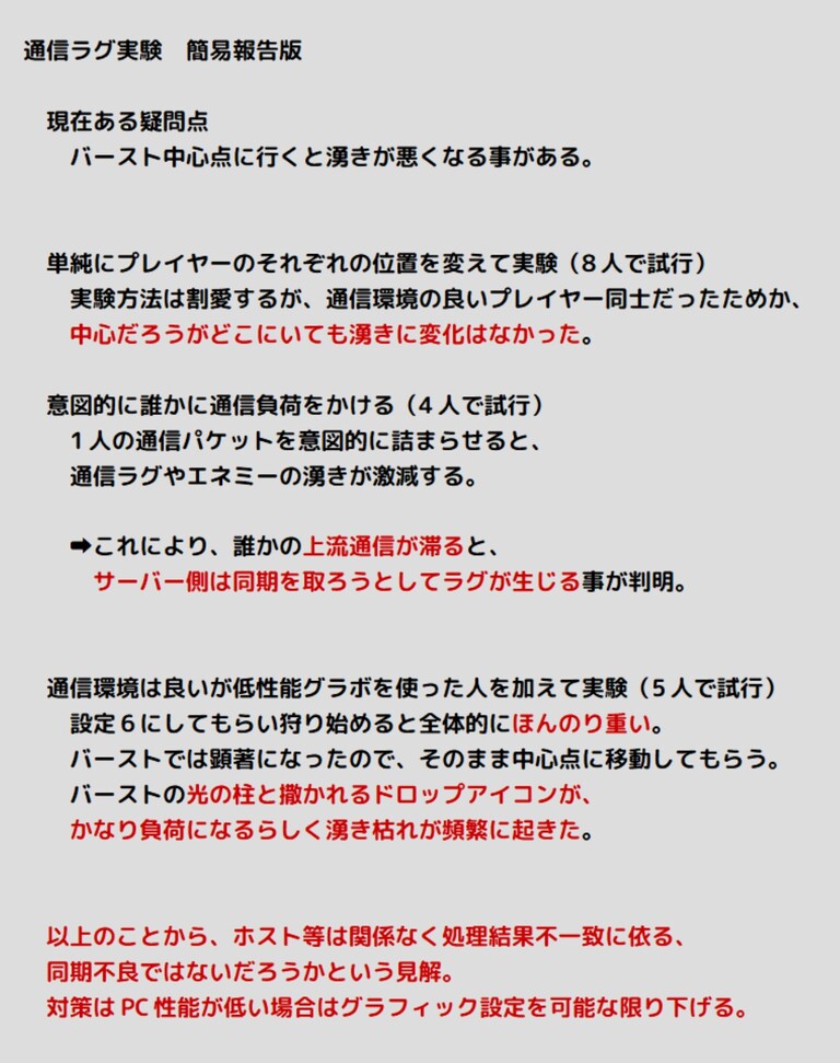 有益な情報大変助かりますでござる。この中で特に「意図的に誰かに通信負荷をかけた実験」の結果と、「低性能グラボを使った実験」の結果は全アークスが知っておくべき重要な情報でござるな。