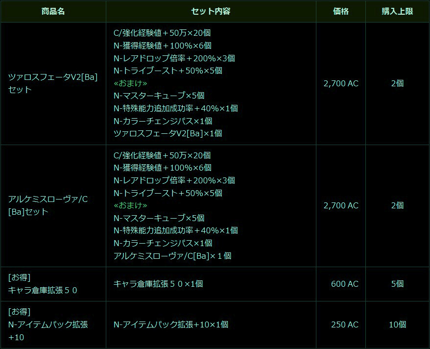様々なアイテムが詰まっているため一見お得に見えるが、おまけの存在によって割高に。不必要なアイテムが実は多い。ツァロスフェータV2 [Ba]がどうしても欲しい方向け。アルケミスローヴァ/C [Ba]セット
