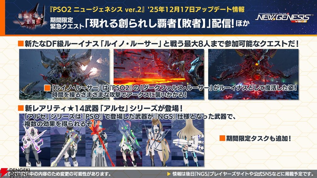 アルセシリーズは、PSO2:NGSで初めて実装された★14武器群で、過去作PSOの伝説的武器をモチーフにした特別なシリーズです。2025年12月17日のアップデートで登場し、現状最強クラスの武器群となっています🔑 アルセシリーズの概要